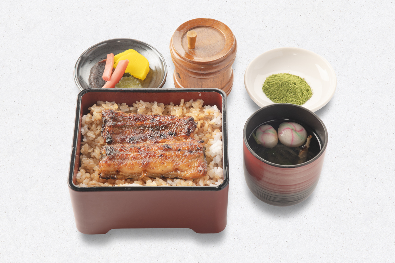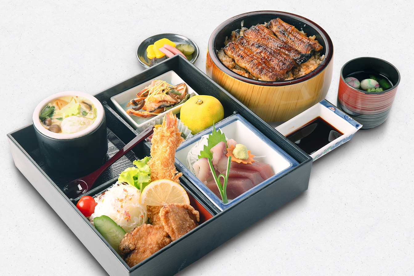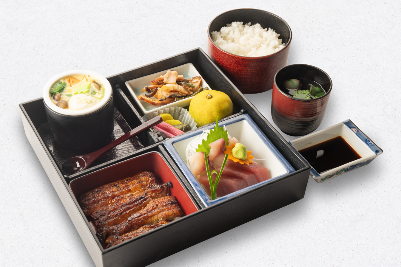 うな重(梅)、刺身(鯉の洗い・まぐろ)、茶碗むし、揚物、小鉢、果物、香の物、きも吸い