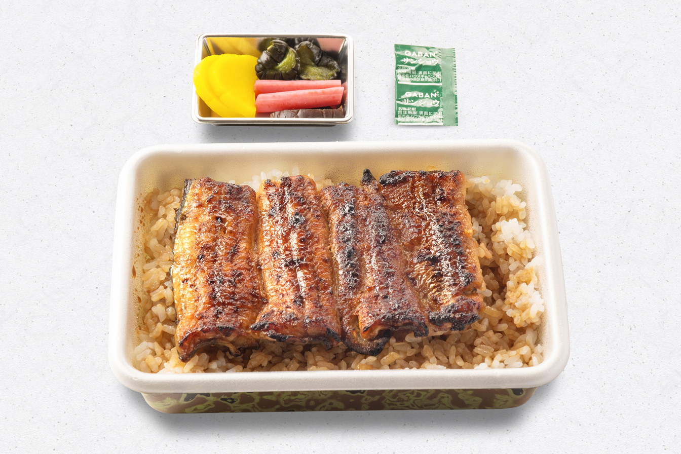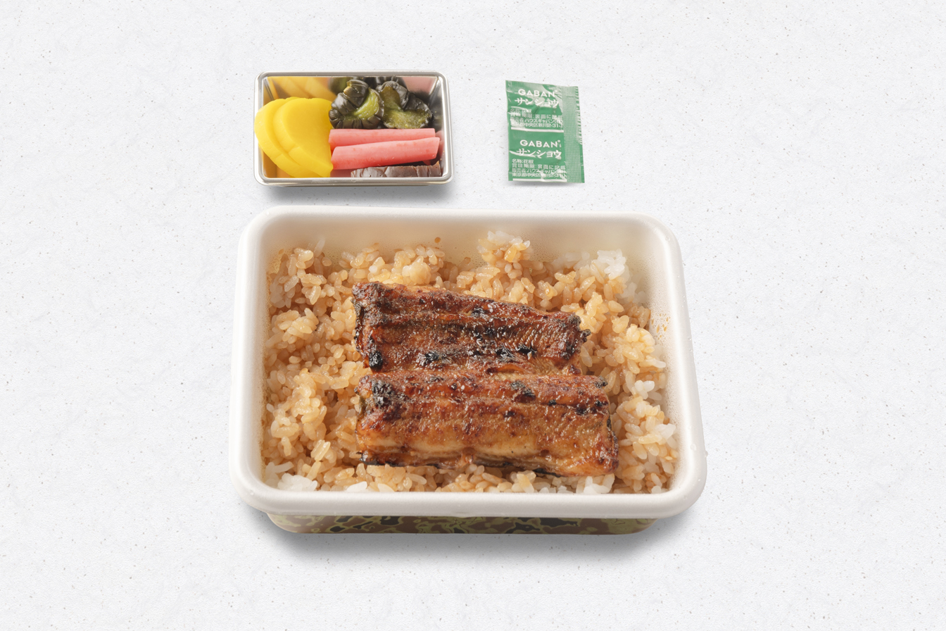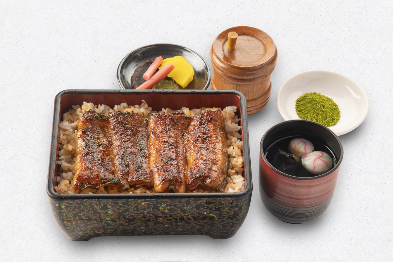 うな重(梅)、刺身(鯉の洗い・まぐろ)、茶碗むし、揚物、小鉢、果物、香の物、きも吸い