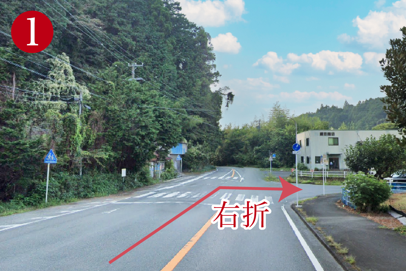 ① 当店より約1km先の「橋本商会」で右折し
