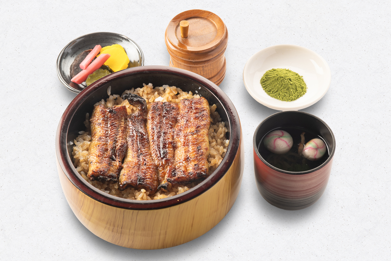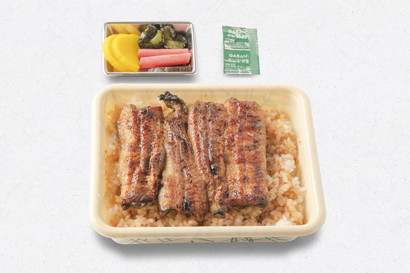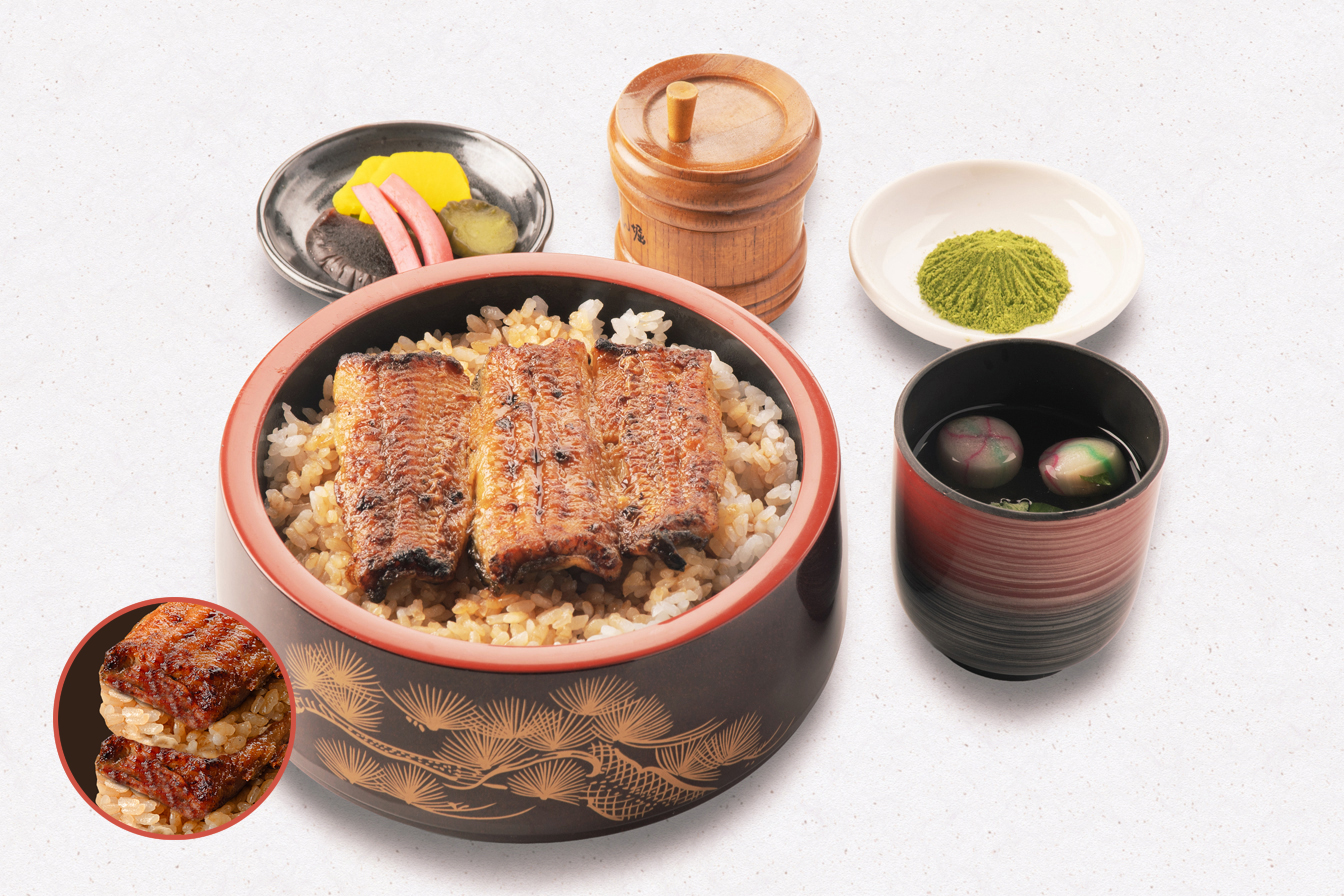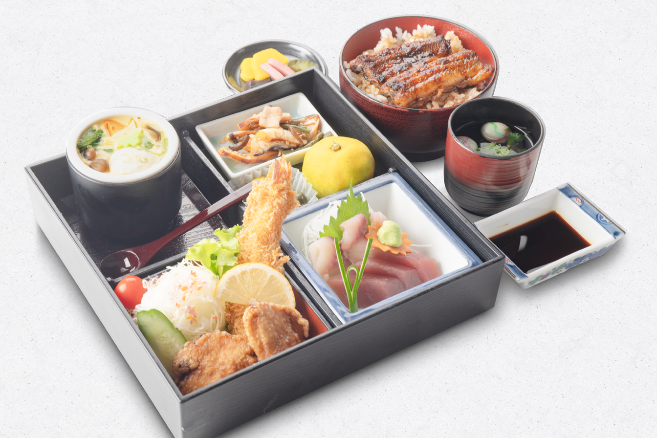 うな重(梅)、刺身(鯉の洗い・まぐろ)、茶碗むし、揚物、小鉢、果物、香の物、きも吸い